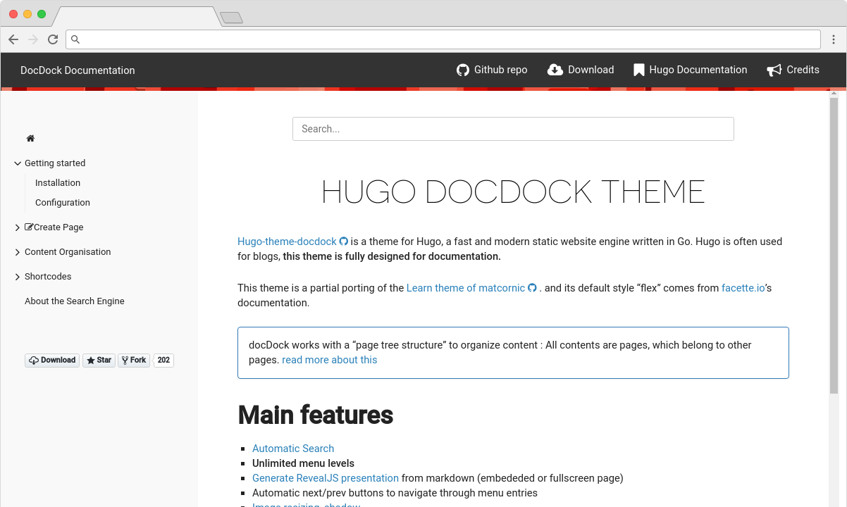 Hugo-theme-docdock is a theme for Hugo, a fast and modern static website engine written in Go. Hugo is often used for blogs, this theme is fully designed for documentation.