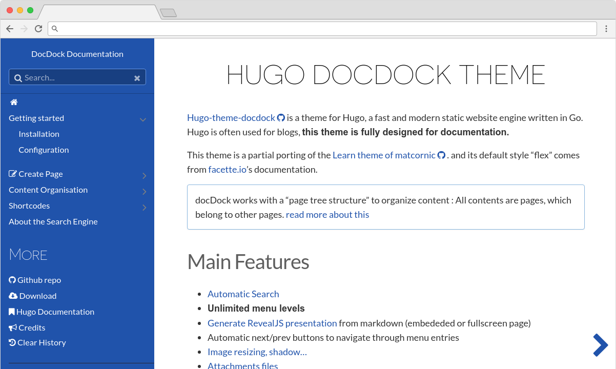 This current documentation has been statically generated with Hugo with a simple command : hugo -t docdock – source code is available here at GitHub
